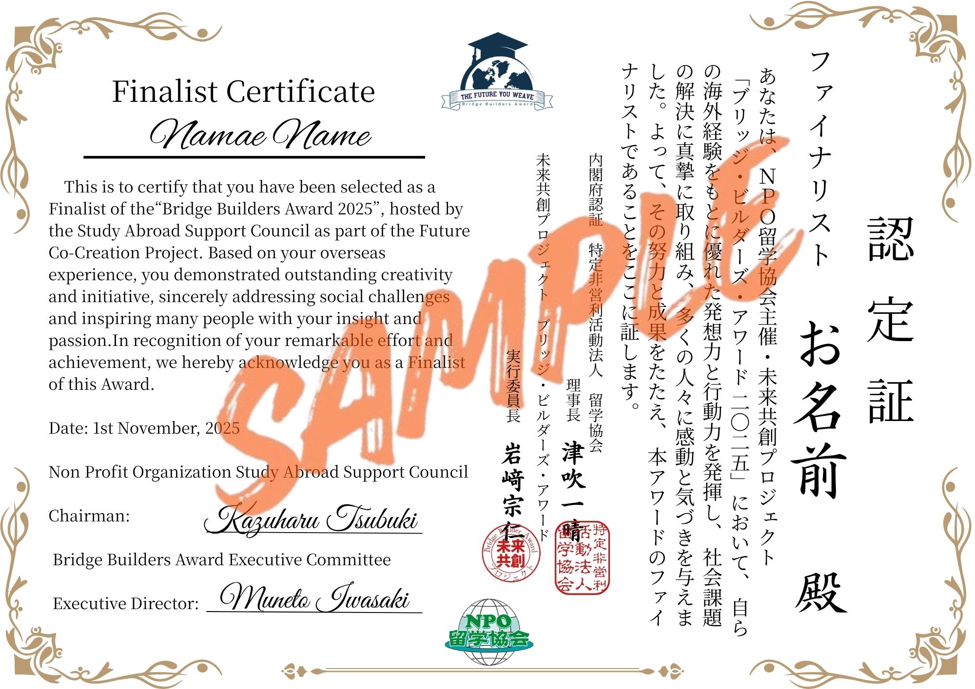 さらに、最終選考に進み、惜しくも上記の賞を逃した方には、「グローバルアクション賞」として、賞状を贈呈いたします。