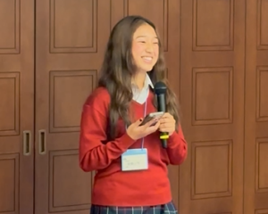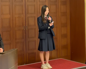 総評:カナダで多様なルーツを持つ人々との交流体験を通じて、問題提起が明瞭に整理されていました。さらに、すべて英語でプレゼンテーションされたことも、留学で培われた力として高く評価されました。今後の取り組みについて具体性が示されていれば、より説得力が増したと思います。